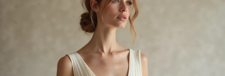 Ces décolletés peuvent être réalisés avec des découpes géométriques précises ou des drapés plus fluides, s’adaptant ainsi à différents styles de robes. Ils mettent en valeur le buste de manière subtile et élégante, créant un point focal intéressant sans compromettre la sophistication de l’ensemble.
